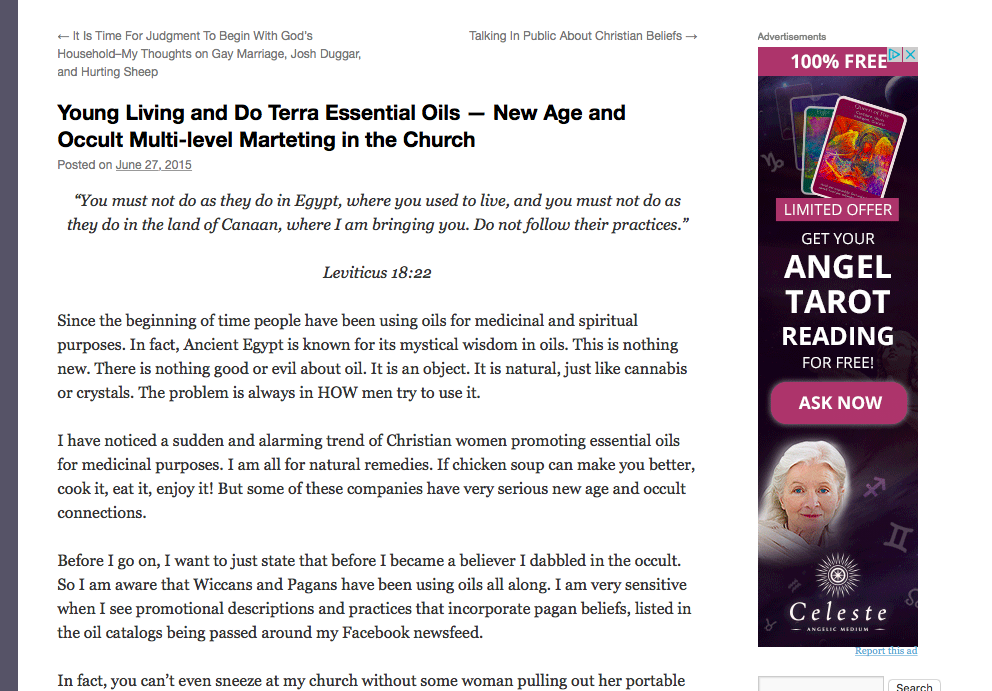 As my Young Living team grows, the same online articles seem to surface over and over: The first article is from The Last Hiker entitled “Young Living and Do Terra Essential Oils — New Age and Occult Multi-level Marteting in the Church” Posted on June 27, 2015. The other is from Woman of Grace entitled “Essentials Oils and the Occult” Posted on March 18, 2016 by SBrinkmann. It has become clear that someone needed to write an article laying out the truth in these matters.